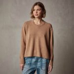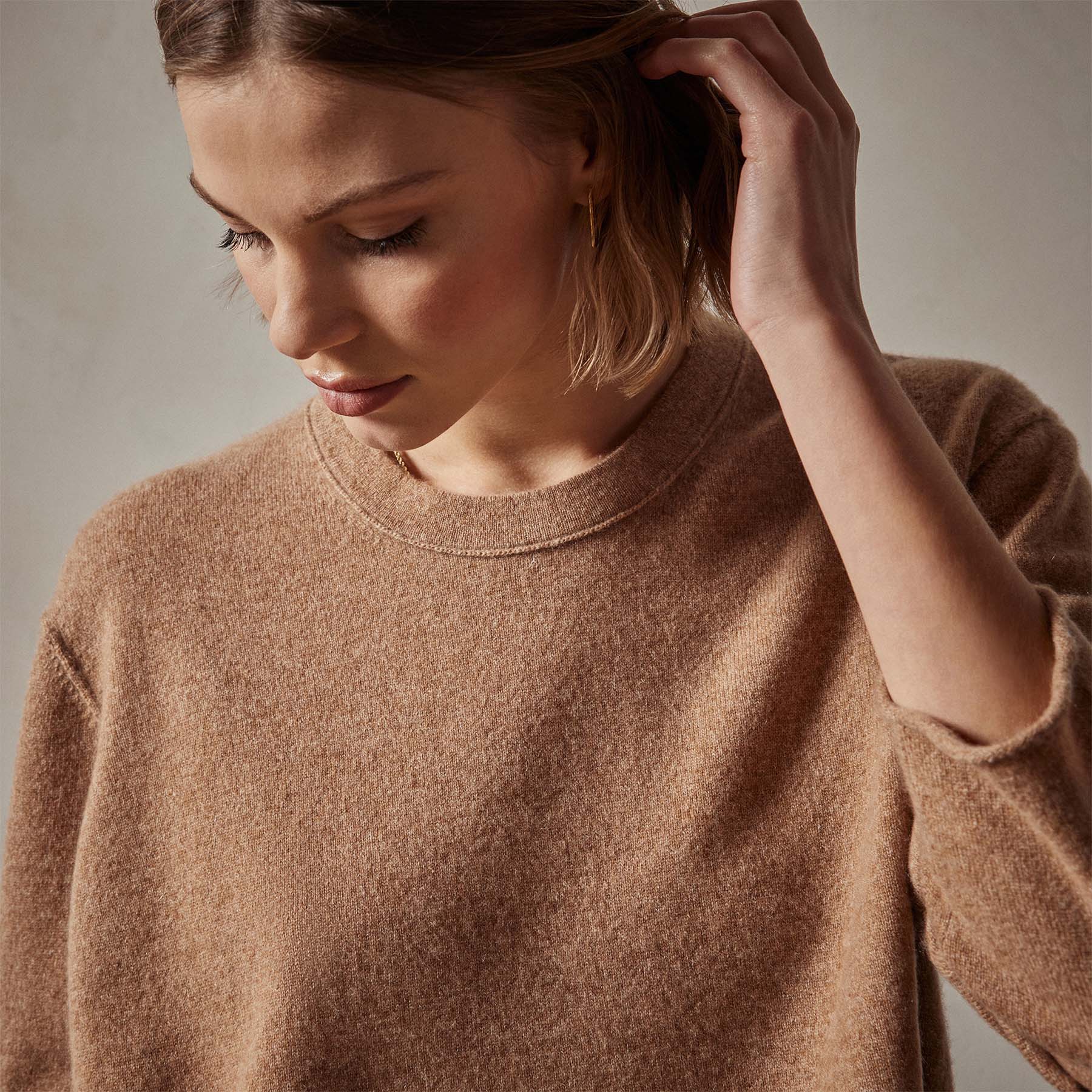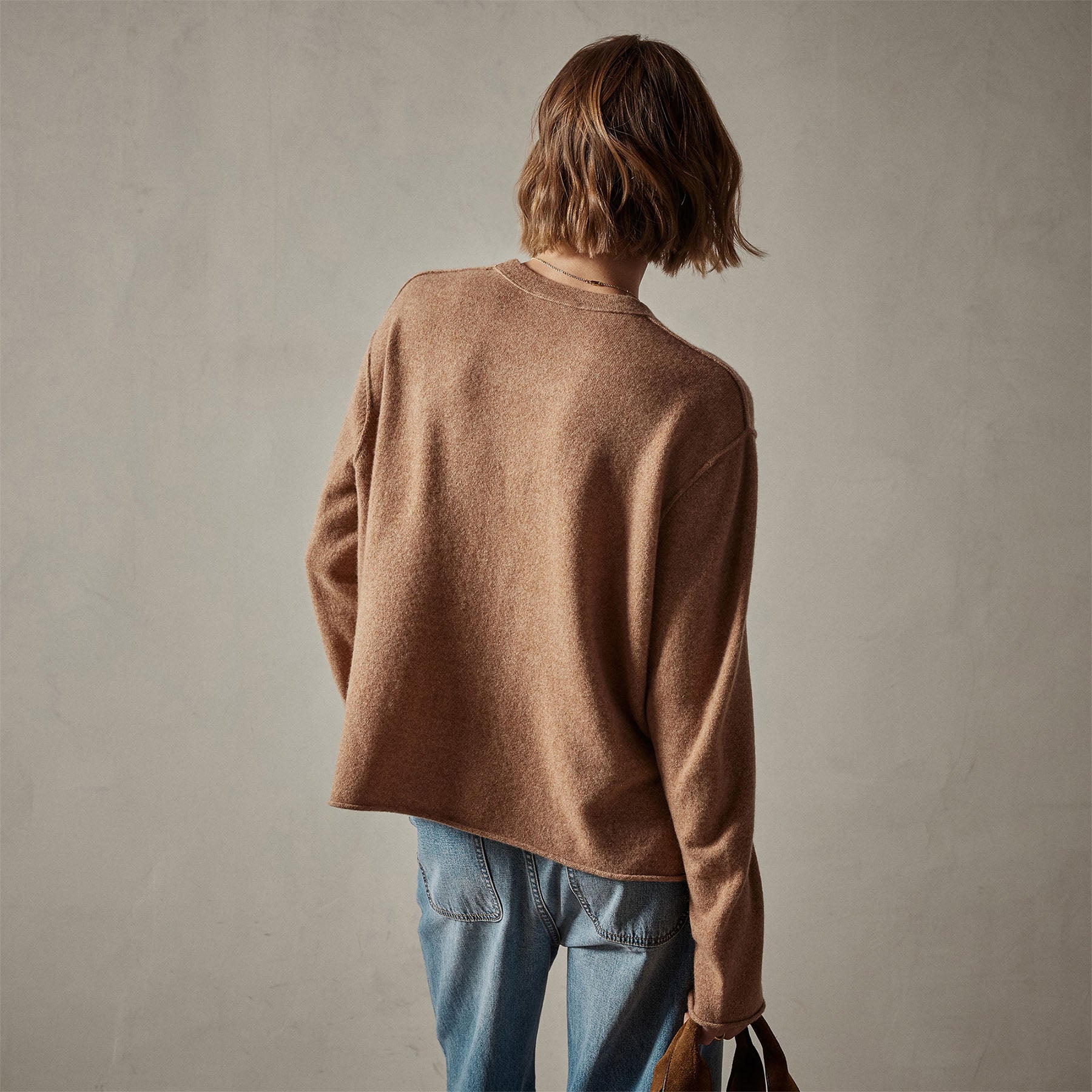 The Recycled Cashmere Boxy Crew Neck is made from recycled cashmere fibers. Style details include exposed linking at sleeve, rolled hem at bottom opening and sleeve. Boxy fit.