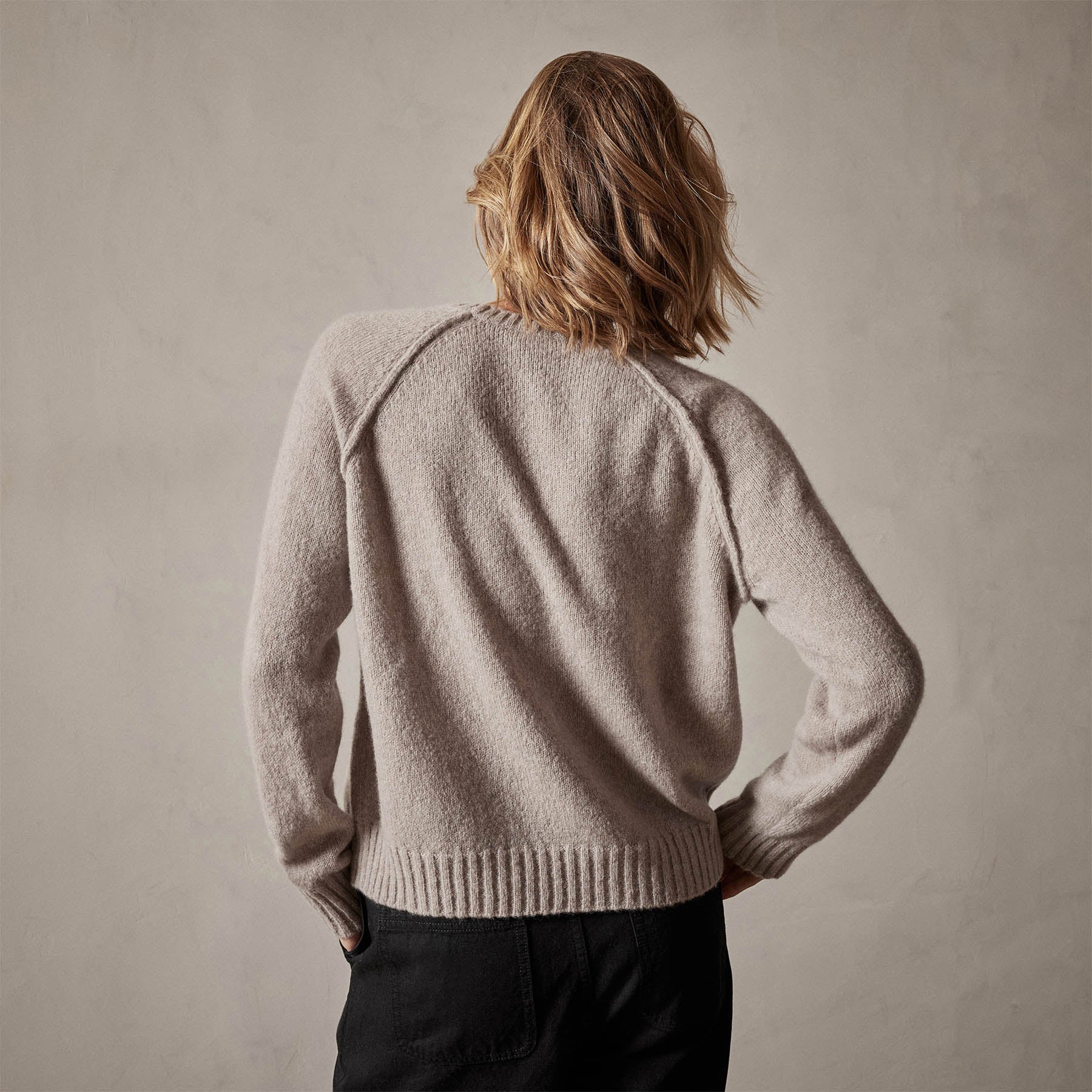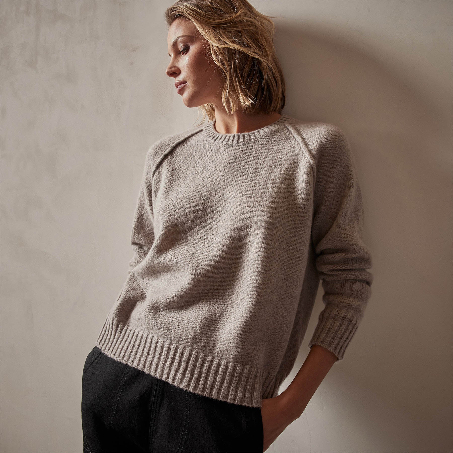 Our Mid Gauge Cashmere Raglan Crew Sweater is made in a luxe and lightweight cashmere. Style details include exposed linking at raglan seam, rib trim at neckline, cuffs and bottom hem. Relaxed fit.