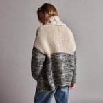 The Chunky Hand Knit Beach Cardigan features a color block detail and an open bottom. Style details include exposed linking at the center back hem, exaggerated shawl collar and slash pockets. Oversized fit