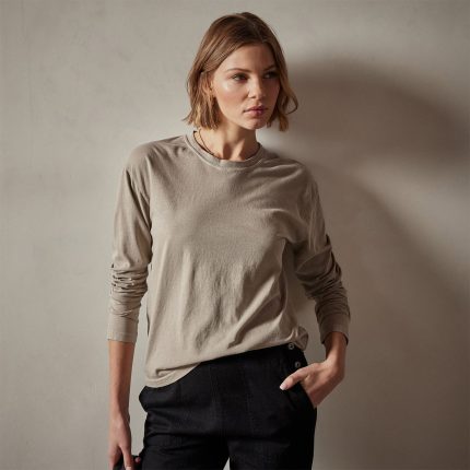 Our Cotton Cashmere Rib Long Sleeve Crew Neck is a super fine, light rib Japanese fabric. The fabric is lightweight yet has a luxuriously soft hand. Style details include raw edge at bottom opening & sleeve. Fitted