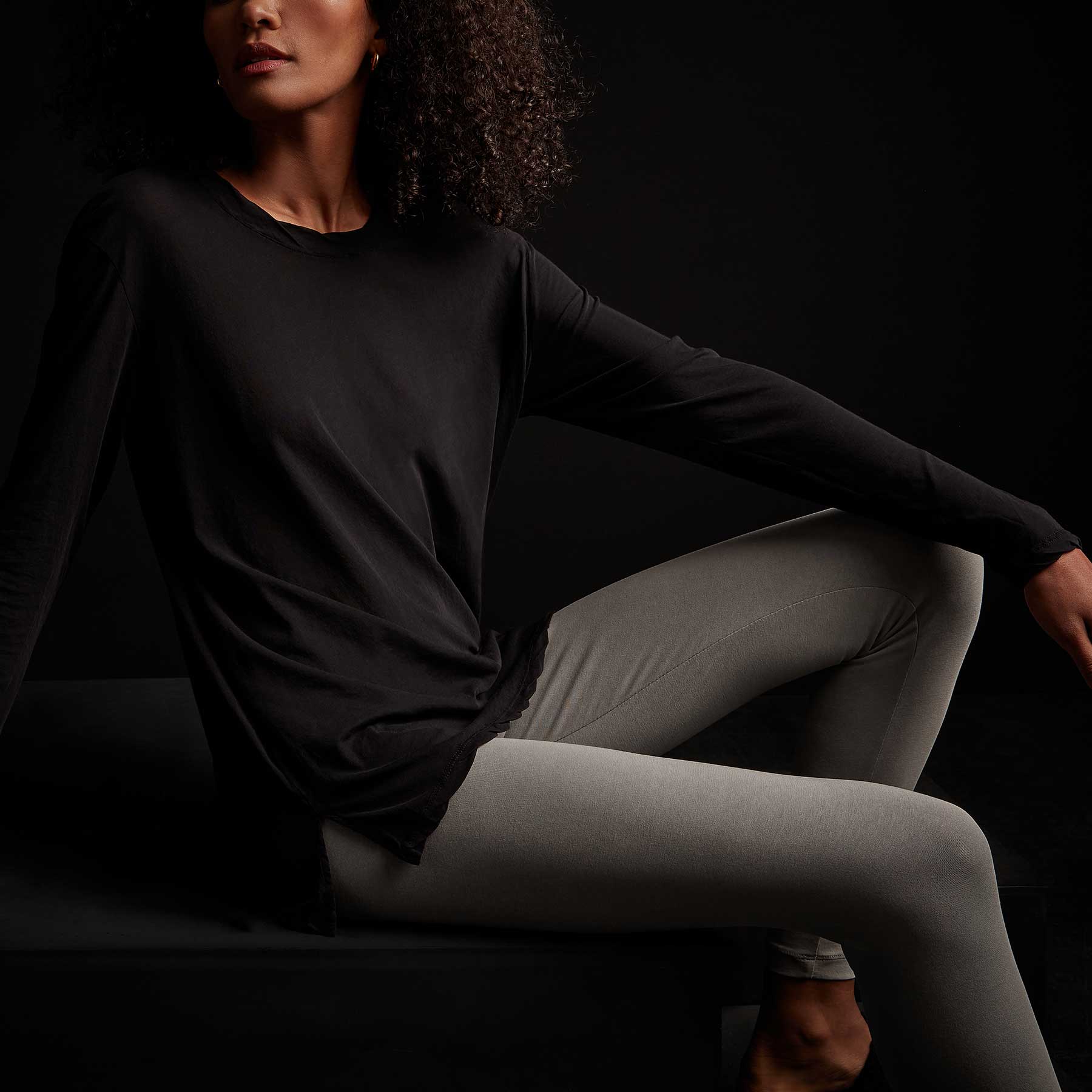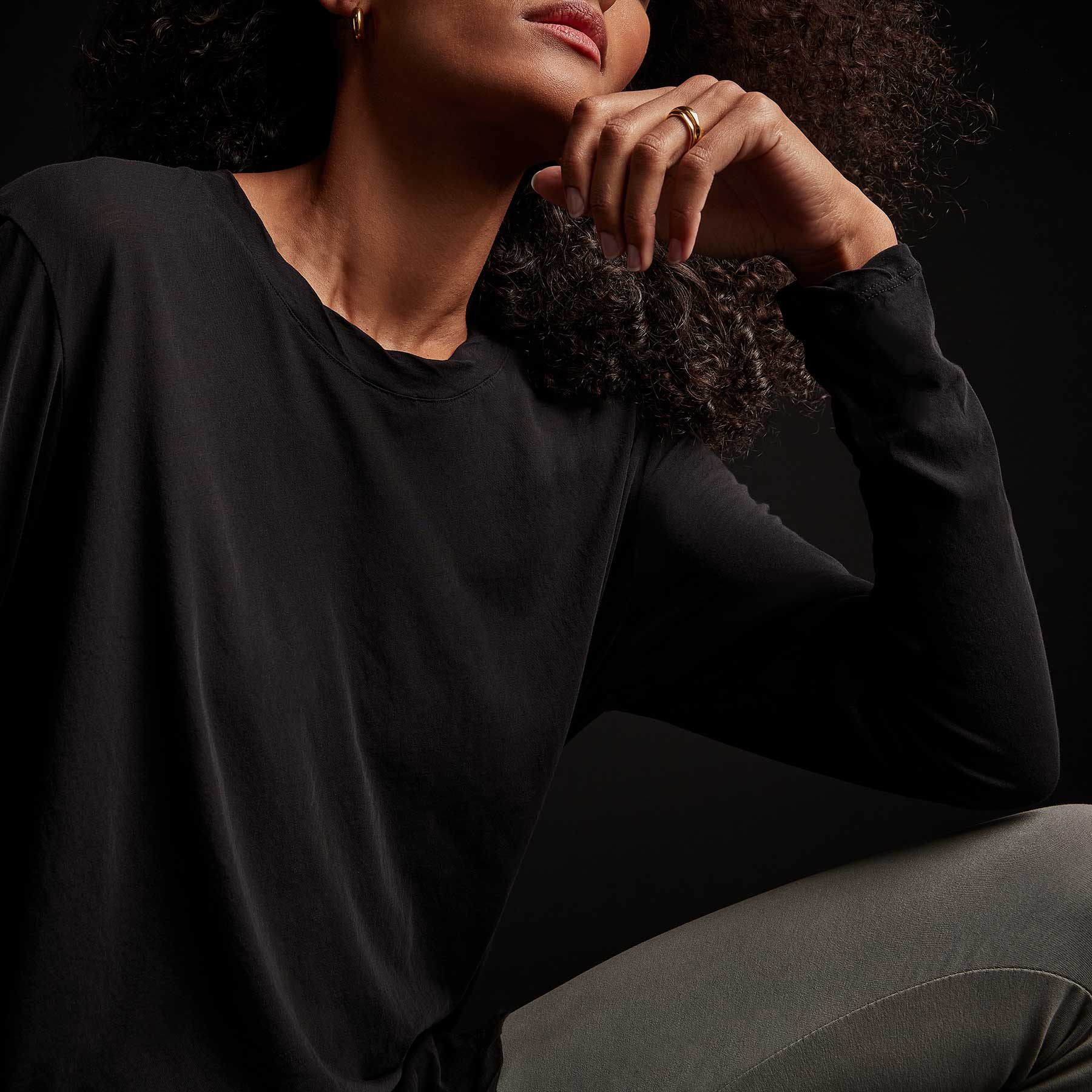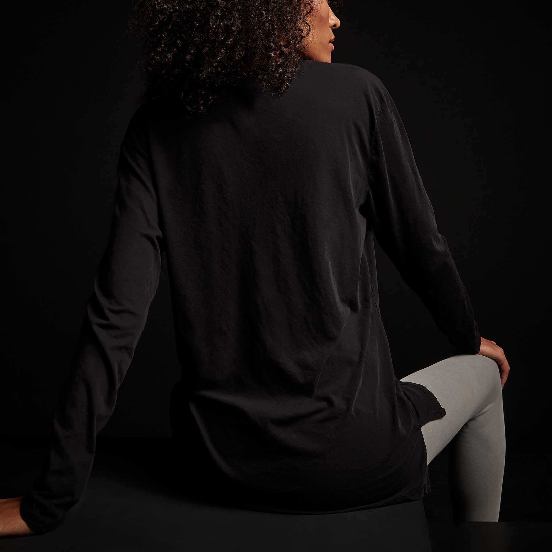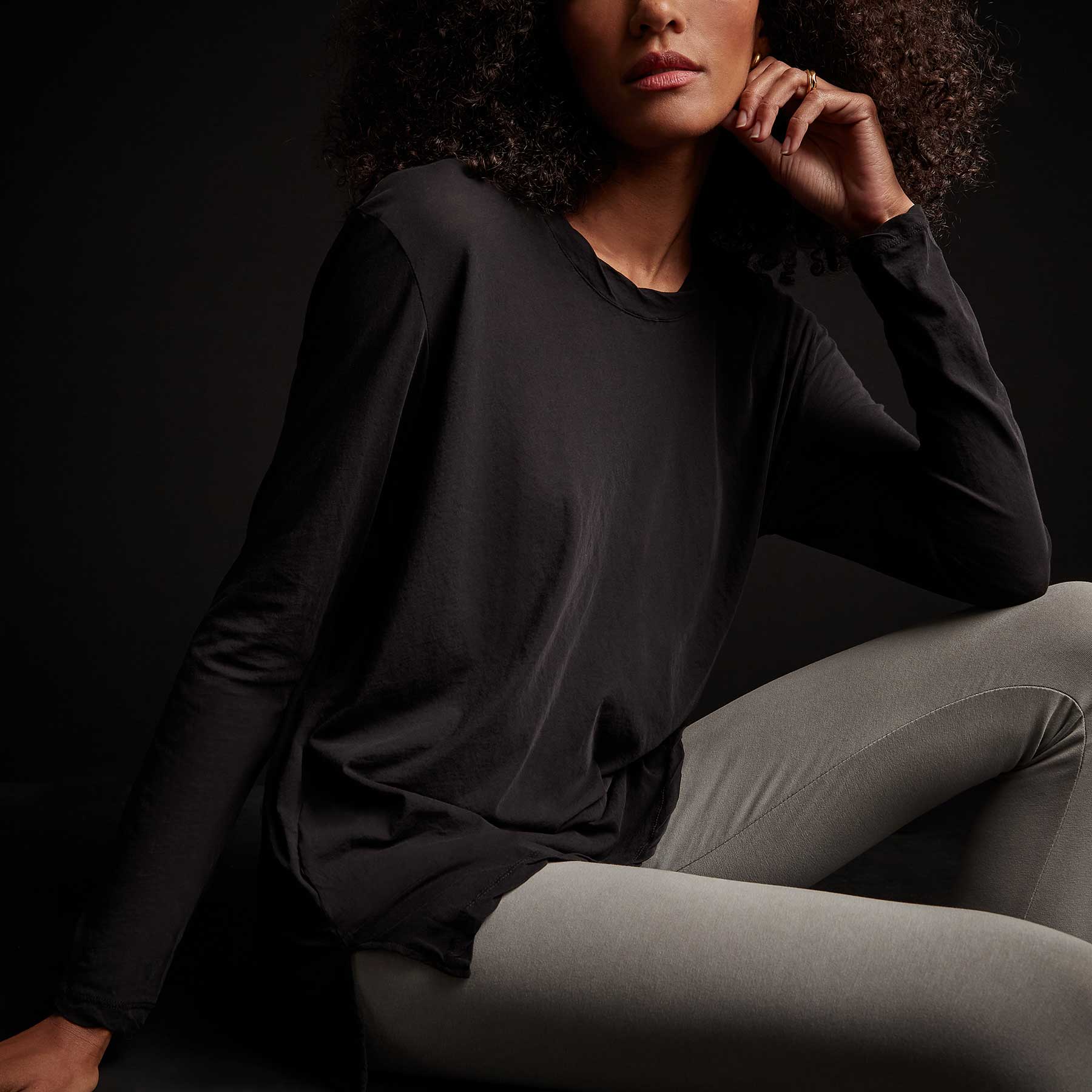 Our long sleeve Jersey Tee is made in a high gauge jersey. Style details include a crew neckline, full length sleeves, side slits and clean finished hems. Relaxed, longer fit.