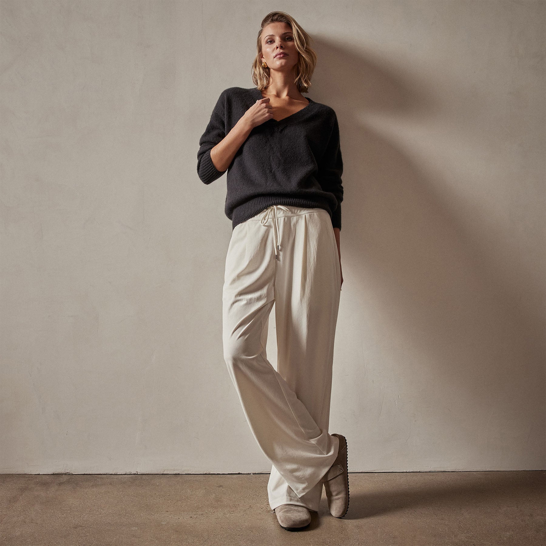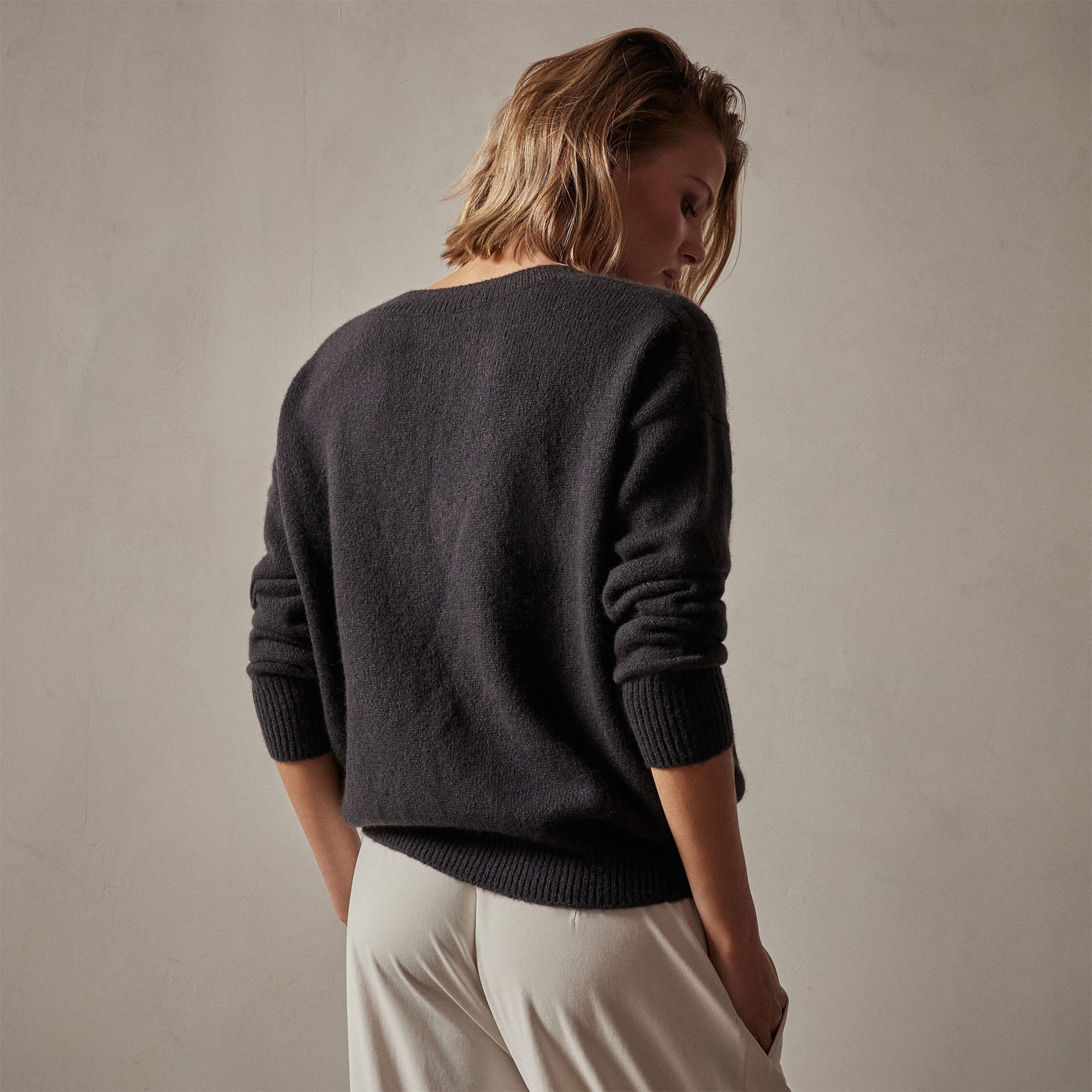 Our Mid Gauge Textured Cashmere Deep V Neck Sweater is made in a luxe and lightweight cashmere. Style details include rib trim at v neckline, cuffs and bottom hem. Relaxed fit.