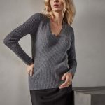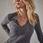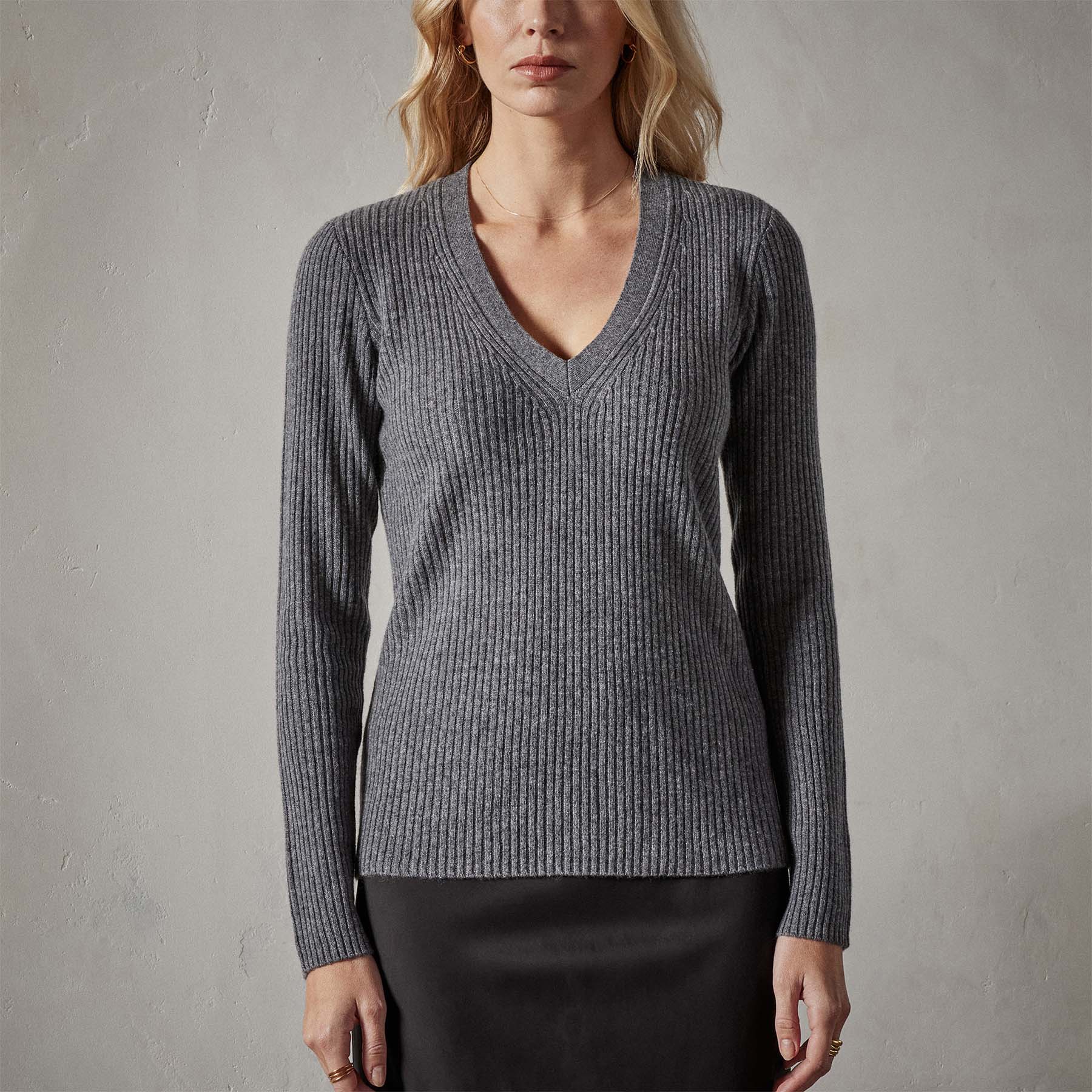 Our Skinny Rib V Neck Sweater is made from recycled cashmere fibers. Style details include an all over rib stitch, binded v neckline and self start hems.