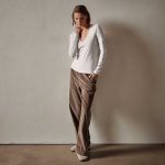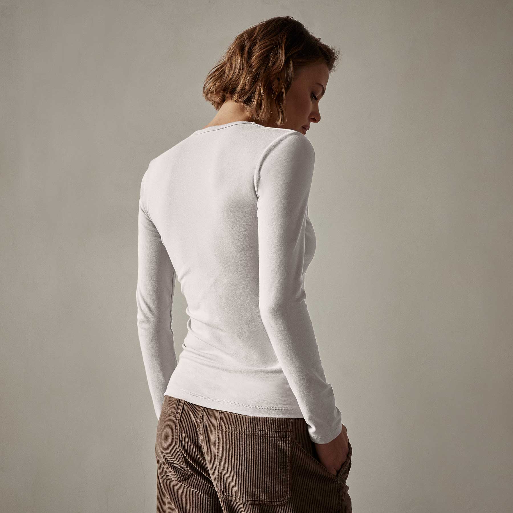 The Stretch Lotus Deep V Tee is knit using the same lotus cotton as our ELJ tops but has added stretch and a fine rib. The double layer front gives a clean neck line and reverts back to the first ever James Perse women’s shirts. It is Japanese fabric made in the USA. Fitted.