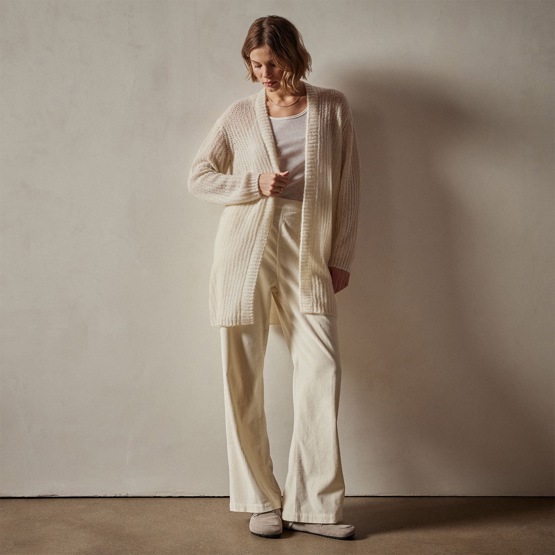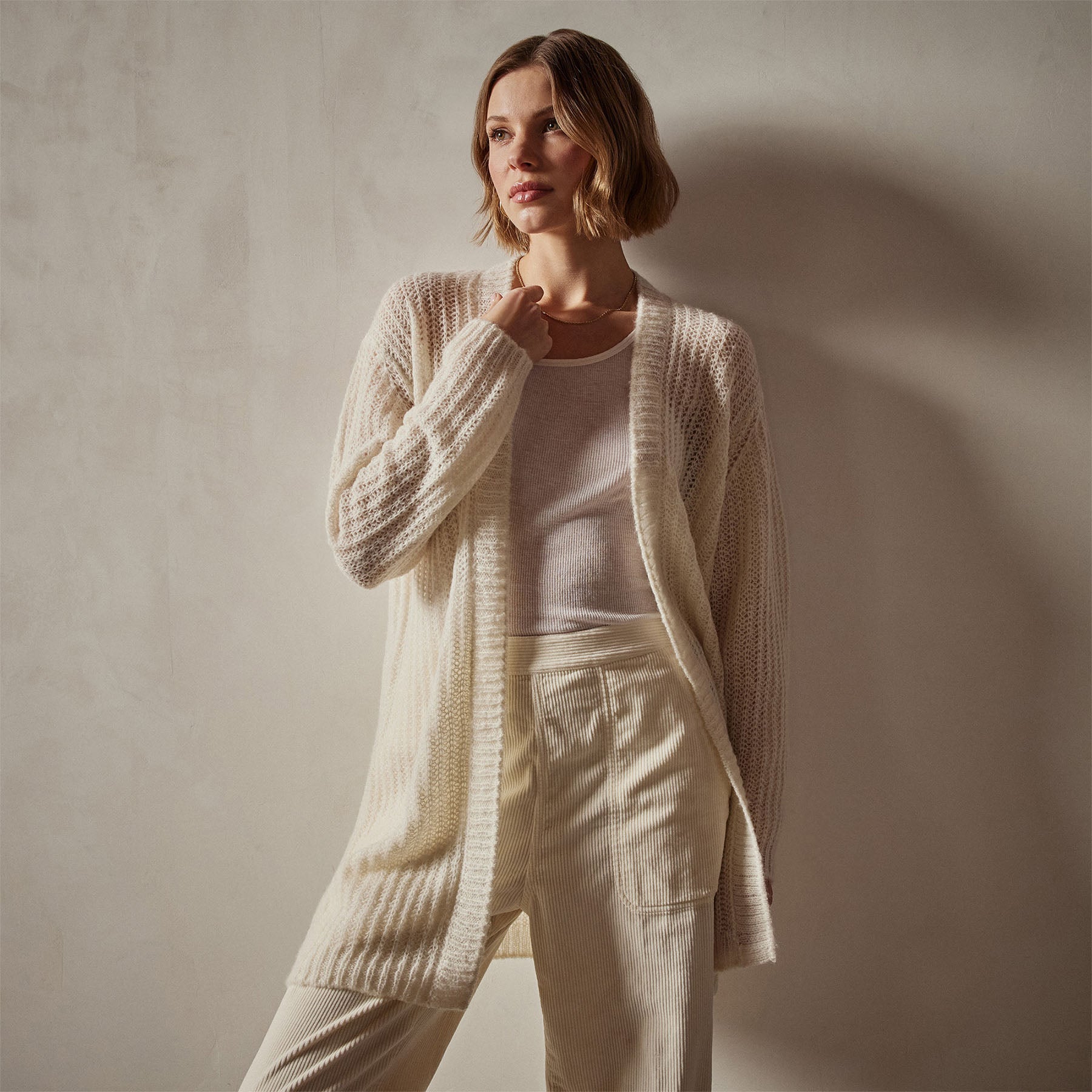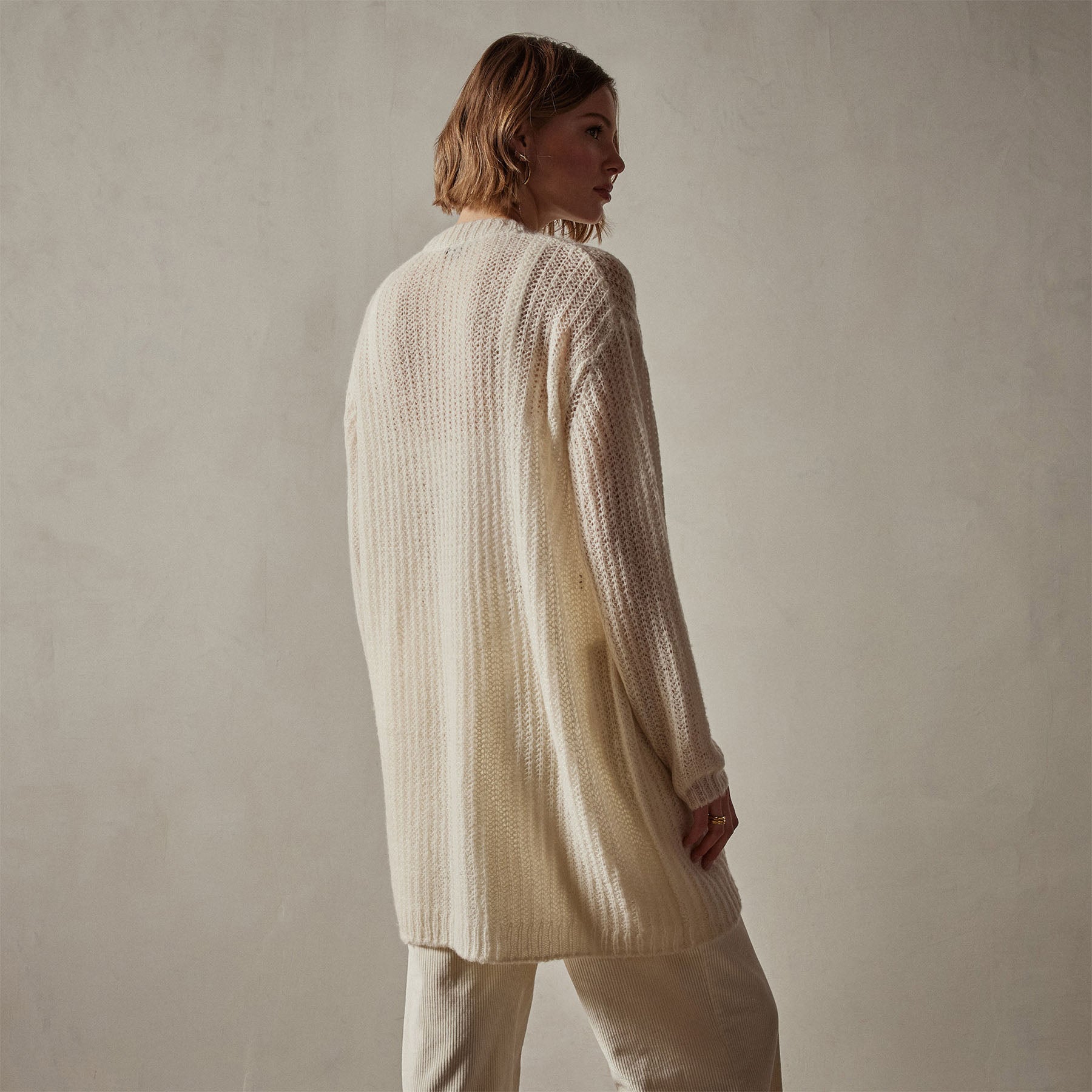 Our Lightweight Cashmere Cobweb Knit Cardigan features an open, loose texture yarn. Style details include rib trim at cuff & opening. Relaxed fit.